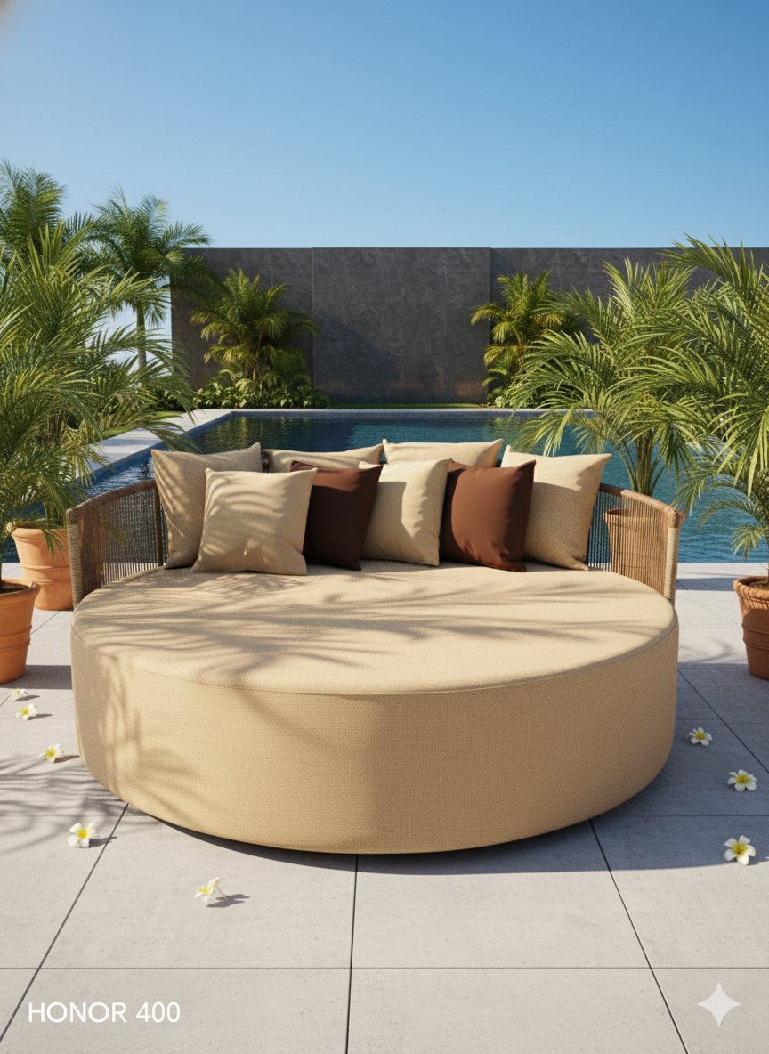 Estructura del espaldar aluminio y tejidos en cordón poliester, base de asiento en madera flor morado y tapizado en tela impermeable, medidas de 1.80 cm de diámetro.