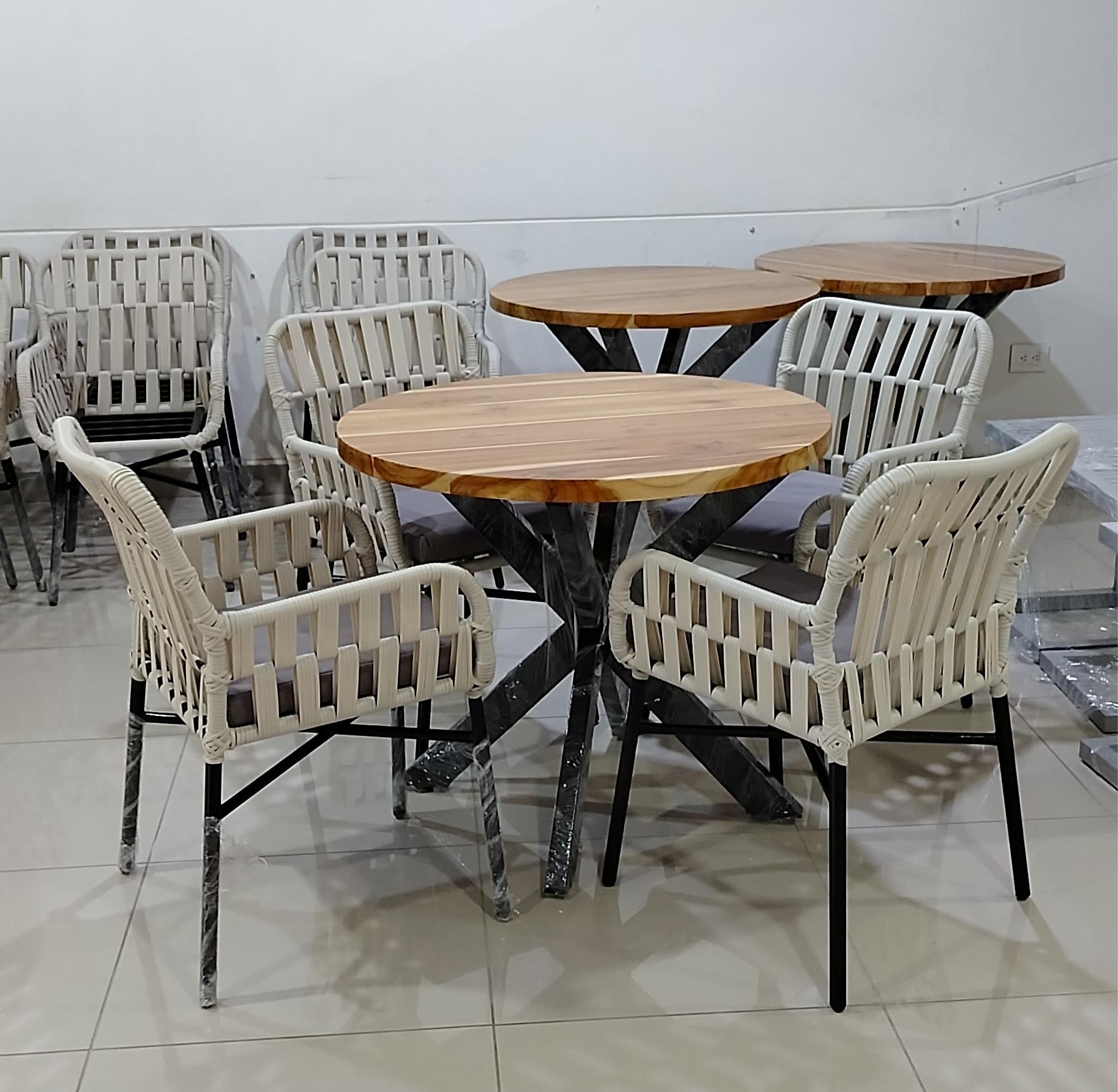 Ideal para exterior total, cuenta con una mesa con tapa de madera teca.