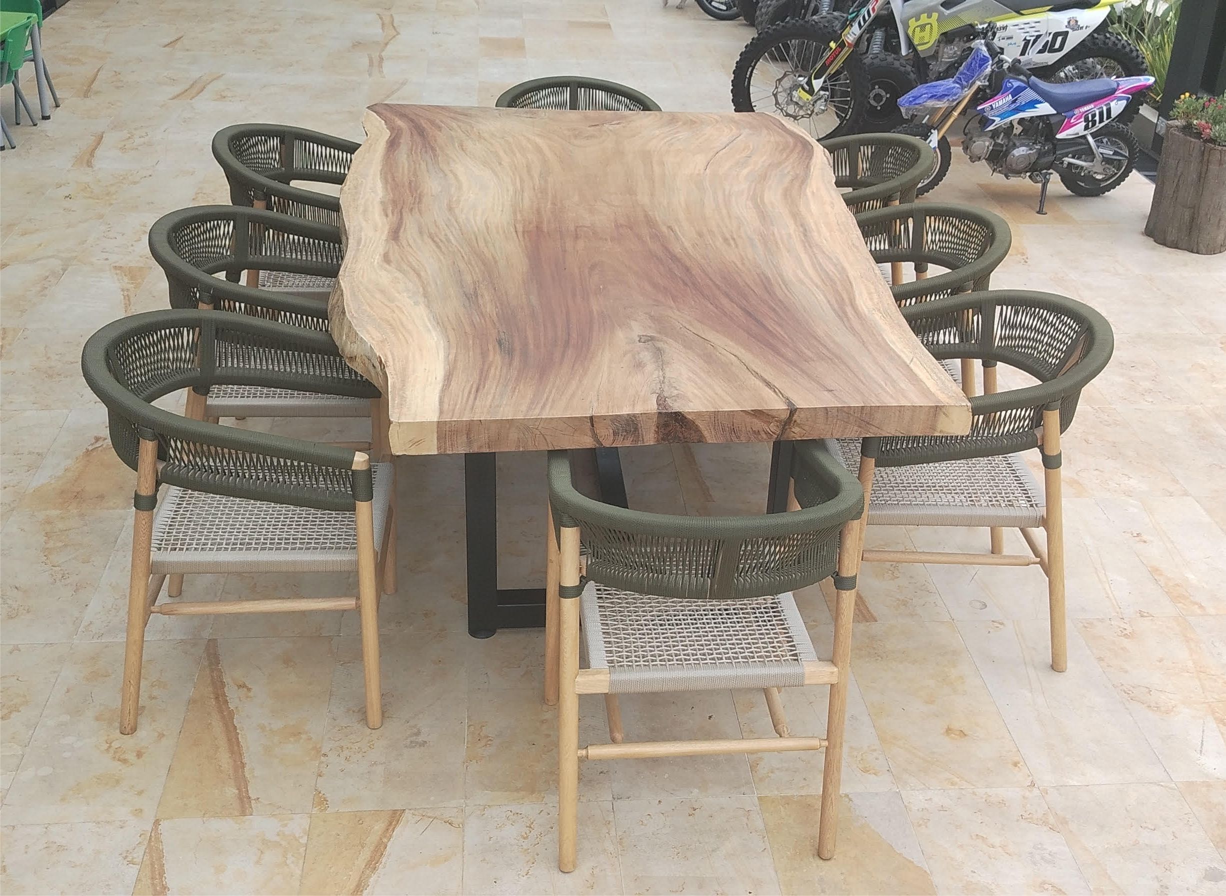 Madera saman para la mesa con patas de metal con pintura electrostática, las sillas están elaboradas en madera roble y tejidos en cordón poliester verde y beig. Para ocupar un espacio grande, un buen comedor con una excelente comodidad.