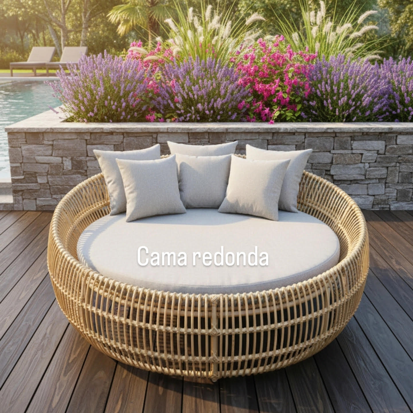 Estructura total de aluminio con pintura electrostática beig cofrado, tejido en ratan sintético media caña y los cojines en tela impermeable suntes. Medidas aproximadas 1.80 cm de diámetro.